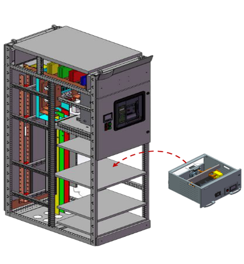 防誤操作聯(lián)鎖由斷路器操作手柄機(jī)構(gòu)和抽屜位置機(jī)械聯(lián)鎖操作機(jī)構(gòu)共同完成,邏輯性極強(qiáng),靈活實(shí)現(xiàn)柜間聯(lián)鎖
